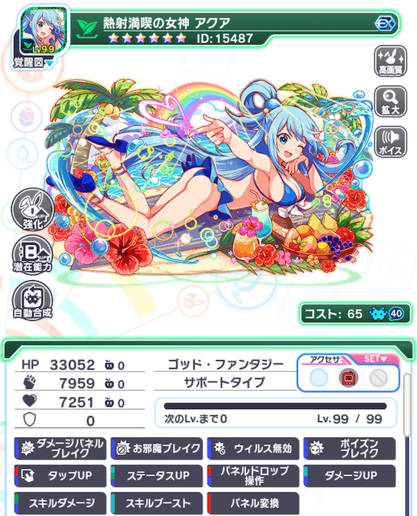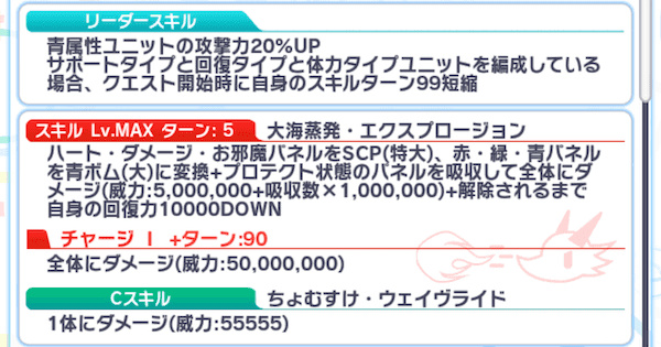 ユニットスキル「大海蒸発・エクスプロージョン」 全体にダメージ(威力:2500000)+ハート・お邪魔パネルをSCP(大)、赤・緑・青を青ボムに変換+解除されるまで自身の回復力10000DOWN ↓ ハート・ダメージ・お邪魔パネルをSCP(特大)、赤・緑・青パネルを青ボム(大)に変換+プロテクト状態のパネルを吸収して全体にダメージ(威力:5,000,000+吸収数×1,000,000)+解除されるまで自身の回復力10000DOWN チャージ I 全体にダメージ(威力:50,000,000) |