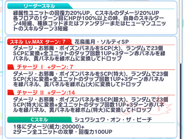 ユニットスキル「花鳥風月・ソルティSP」 ランダムで23個SCP、お邪魔パネルをSCP(大)に変換+全ユニットのタップ回数1UP+3ターン赤パネルを緑パネル、黄を緑ボムに変換してドロップ ↓ ダメージ・お邪魔・ポイズンパネルをSCP(大)、ランダムで23個SCPに変換+全ユニットのタップ回数1UP+3ターン赤パネルを緑パネル、黄パネルを緑ボムに変換してドロップ チャージ I ダメージ・お邪魔・ポイズンパネルをSCP(特大)、ランダムで23個SCP(大)に変換+全ユニットのタップ回数1UP+3ターン赤パネルを緑パネル、黄パネルを緑ボム(大)に変換してドロップ チャージ II ダメージ・お邪魔・ポイズンパネルをSCP(超大)、ランダムで23個SCP(特大)に変換+全ユニットのタップ回数1UP+3ターン赤パネルを緑パネル、黄パネルを緑ボム(特大)に変換してドロップ |