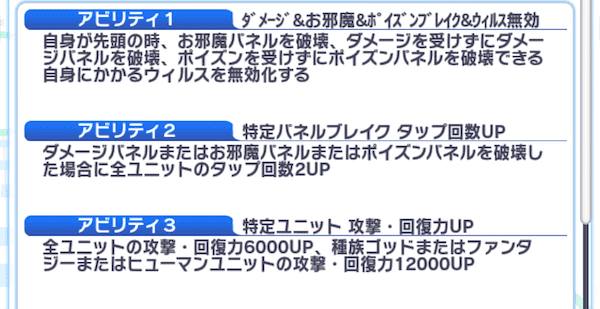 アビリティ2:お邪魔パネルブレイク タップ回数UP お邪魔パネルを破壊した場合に全ユニットのタップ回数2UP ↓ アビリティ2:特定パネルブレイク タップ回数UP ダメージパネルまたはお邪魔パネルまたはポイズンパネルを破壊した場合に全ユニットのタップ回数2UP |