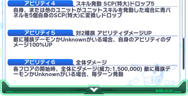 アビリティ6:スキル発動 SCP(大)ドロップ3 自身、または他のユニットがユニットスキルを発動した場合に青パネルを3個自身のSCP(大)に変換しドロップ ↓ アビリティ6:全体ダメージ 各フロアの開始時、全体にダメージ(威力:1,500,000) 敵に種族デーモンかUnknownがいる場合、毎ターン発動 |