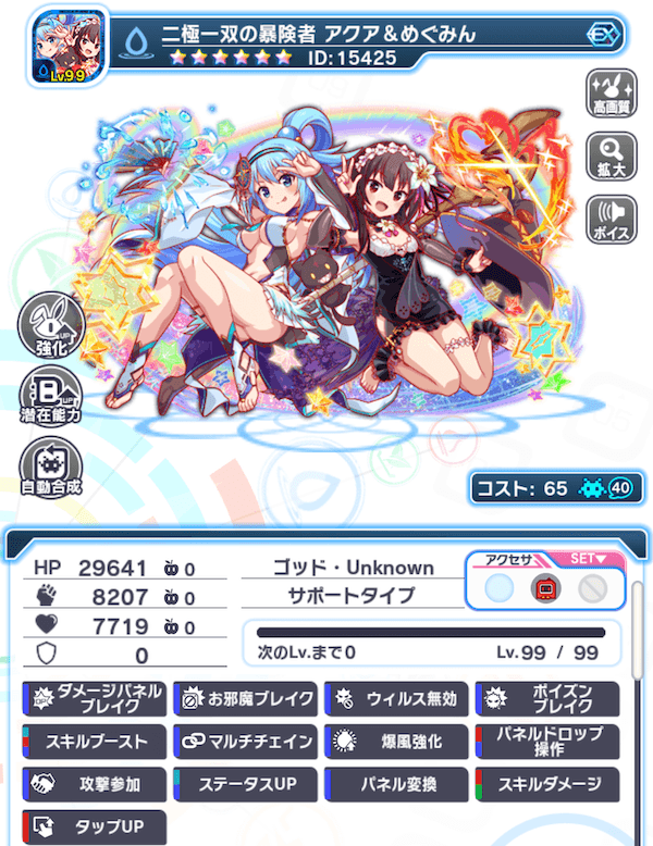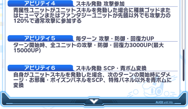 アビリティ4:お邪魔パネルブレイク 攻撃・回復力UP お邪魔パネルを破壊した場合に全ユニットの攻撃・回復力1500UP ↓ アビリティ4:スキル発動 SCP(特大)ドロップ5 自身、または他のユニットがユニットスキルを発動した場合に青パネルを5個自身のSCP(特大)に変換しドロップ |