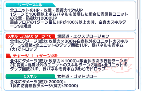 リーダースキル 全ユニットのHP・攻撃・回復力10%UP 1ターンで100個以上ボムを破壊した場合に青属性ユニットの攻撃・防御力3000UP ↓ 全ユニットのHP・攻撃・回復力15%UP 1ターンで100個以上ボムパネルを破壊した場合に青属性ユニットの攻撃・防御力10000UP 最終フロアの1ターン目にHPが100%以上の時、自身のスキルターン99短縮 |