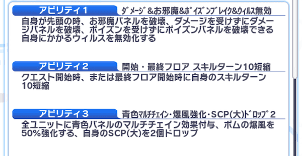 アビリティ6:青属性&Unknown SCP(大)ドロップ2 青属性または種族Unknownユニットが先頭の時、自身のSCP(大)を2個ドロップ ↓ アビリティ6:スキル発動 SCP・青ボム変換 自身がユニットスキルを発動した場合、次のターンの開始時にダメージ・お邪魔・ポイズンパネルをSCP、特殊パネル以外を青ボムに変換 |