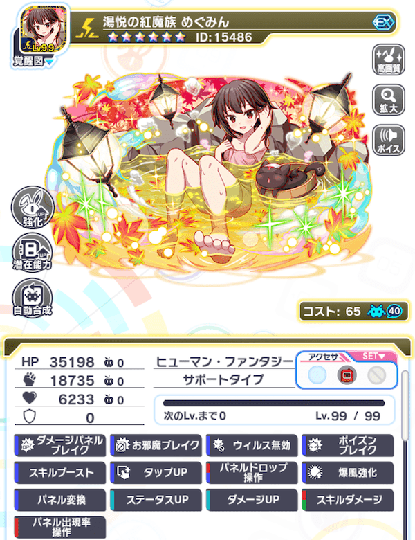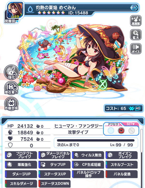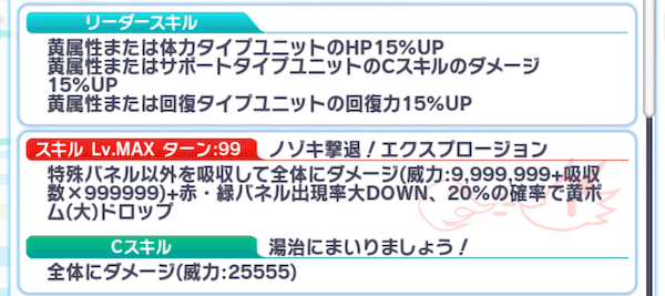 ユニットスキル「ノゾキ撃退!エクスプロージョン」 全体にダメージ(威力:9999999)+属性パネルを全て除去+解除されるまで赤・緑パネル出現率大DOWN、20%の確率で黄ボムドロップ ↓ 特殊パネル以外を吸収して全体にダメージ(威力:9,999,999+吸収数×999999)+赤・緑パネル出現率大DOWN、20%の確率で黄ボム(大)ドロップ |