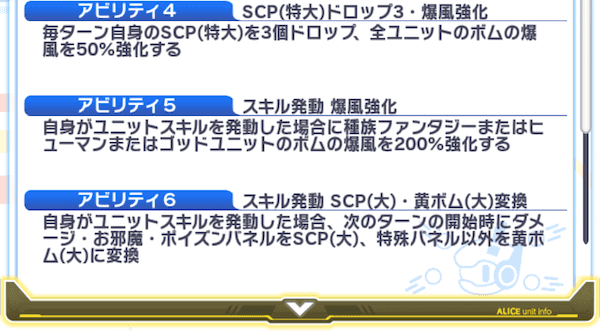 アビリティ4:黄属性&特定種族 SCP(大)ドロップ1 黄属性または種族ファンタジーかUnknownユニットが先頭の時、自身のSCP(大)を1個ドロップ ↓ アビリティ4:SCP(特大)ドロップ3・爆風強化 毎ターン自身のSCP(特大)を3個ドロップ、全ユニットのボムの爆風を50%強化する |