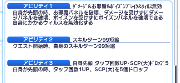 アビリティ3:SCP(大)ドロップ2 自身が先頭の時、SCP(大)を2個ドロップ ↓ アビリティ3:自身先頭 タップ回数UP・SCP(大)ドロップ5 自身が先頭の時、タップ回数1UP、SCP(大)を5個ドロップ |