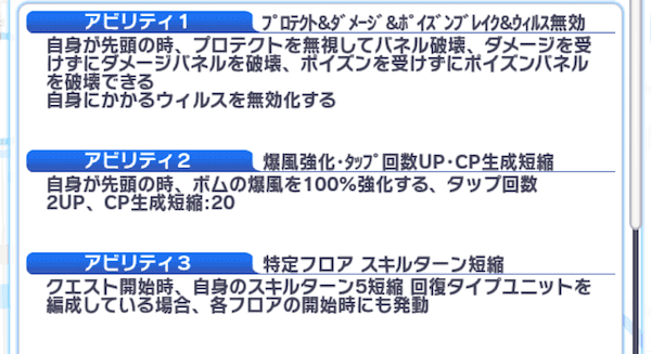 アビリティ3:攻撃力UP・CP生成短縮 自身が先頭の時、自身の攻撃力3000UP、CP生成短縮:4 ↓ アビリティ3:特定フロア スキルターン短縮 クエスト開始時、自身のスキルターン5短縮 回復タイプユニットを編成している場合、各フロアの開始時にも発動 |