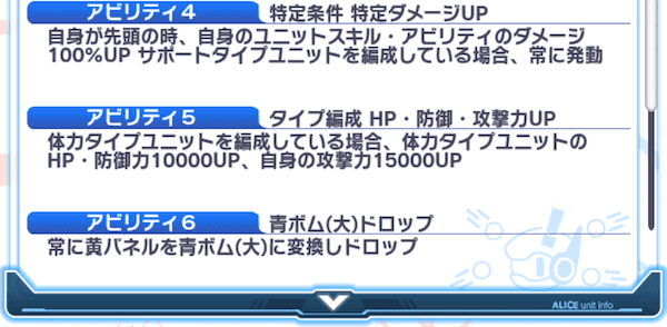 アビリティ5:CP生成短縮・タップ回数UP 自身が先頭の時、CP生成短縮:12、タップ回数2UP ↓ アビリティ5:タイプ編成 HP・防御・攻撃力UP 体力タイプユニットを編成している場合、体力タイプユニットのHP・防御力10000UP、自身の攻撃力15000UP |