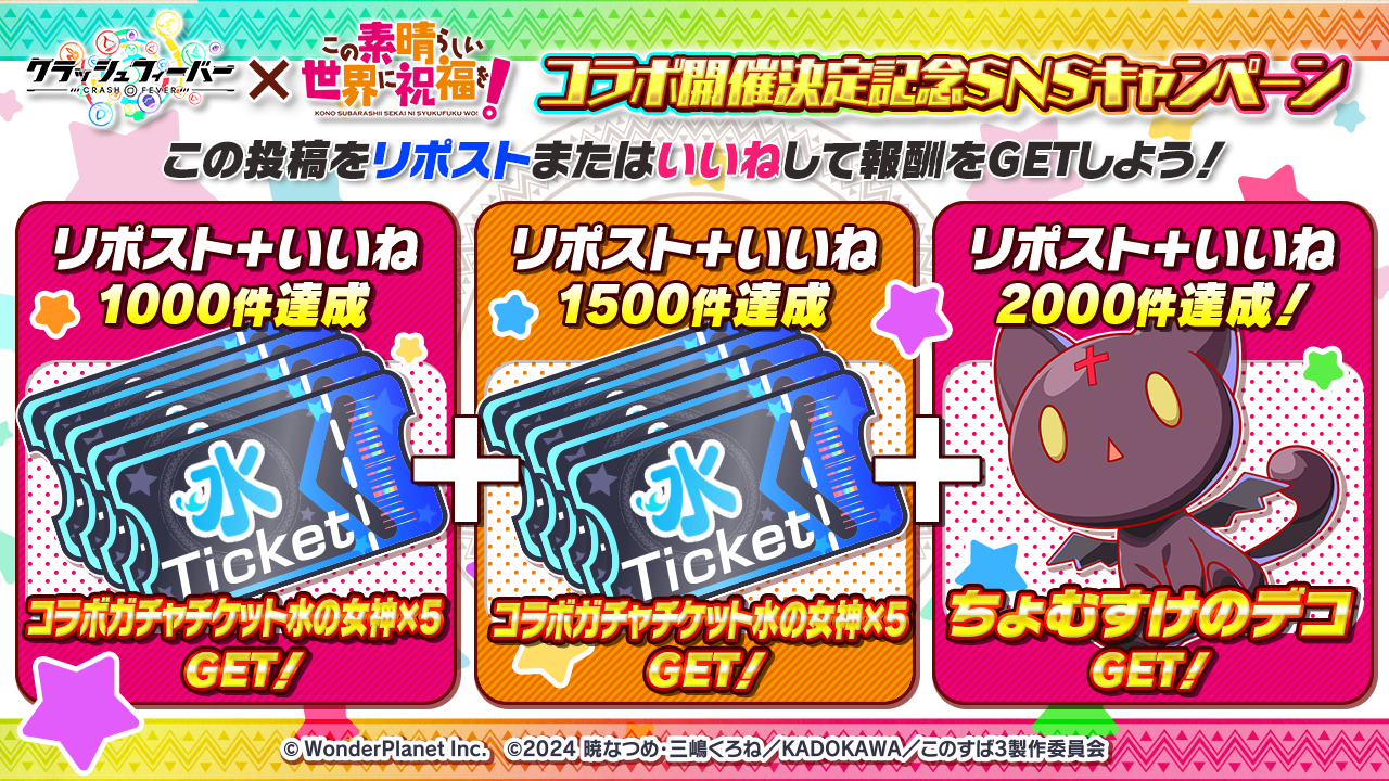 期間中、対象投稿の「リポスト」と「いいね」の合計数が1,000を達成すると、11/27(木)より開催予定のガチャで使用できる「コラボガチャチケット水の女神×5」を全ユーザー様にプレゼント♪