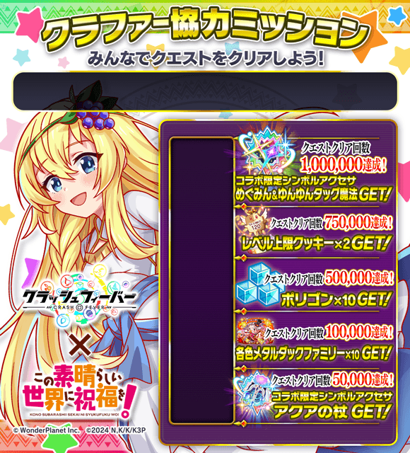 全ユーザーのクエストクリア回数に応じて、「祝福授ける水の女神 アクア」「永遠のライバル めぐみん&ゆんゆん」のシンボルアクセサ、ポリゴンなどの豪華報酬をGET♪