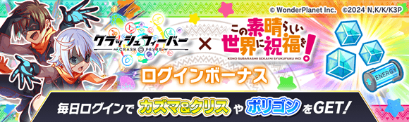 期間中ログインで、コラボユニット「銀髪盗賊団 カズマ&クリス」やポリゴン、期限付きエナジードリンク(100)をプレゼント♪
