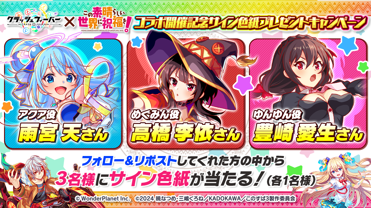 期間中に公式アカウントをフォロー&対象投稿をリポストしてくれた方の中から抽選で3名様に、「声優サイン色紙」を1枚ずつプレゼントいたします!