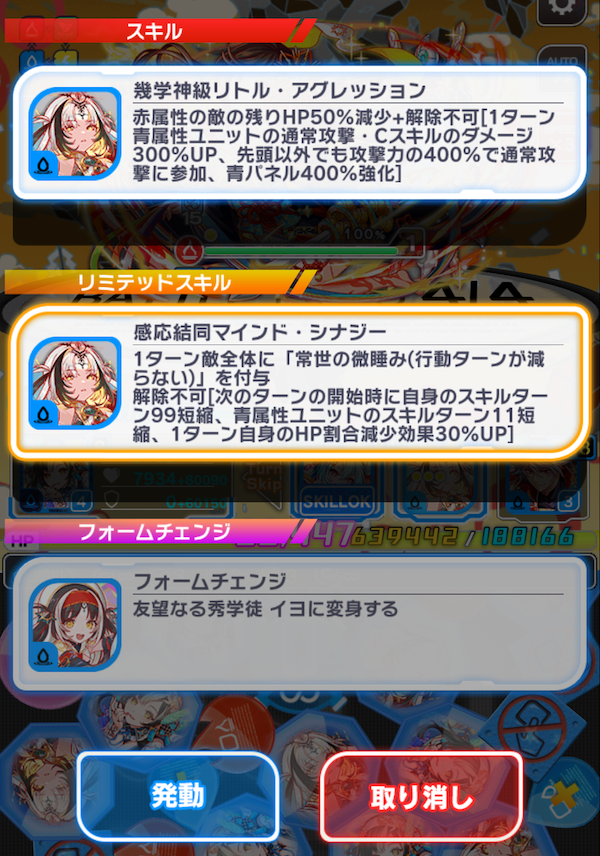 「結心する真考儀 イヨ」のリミテッドスキルを使用すると、敵に「常世の微睡み」状態を付与できます。
